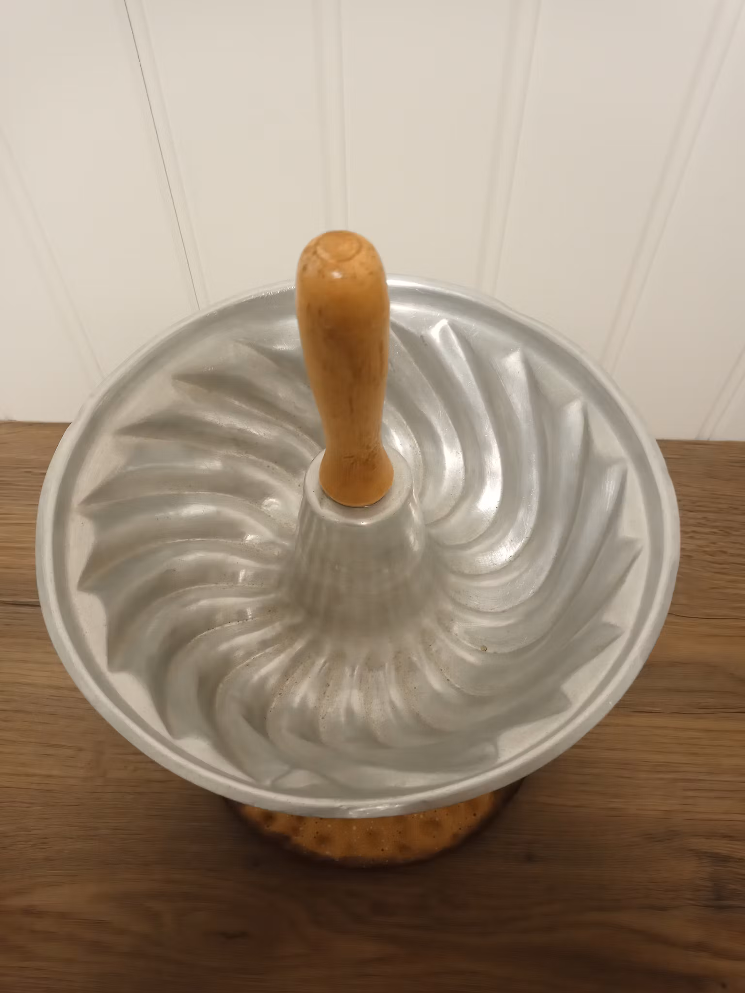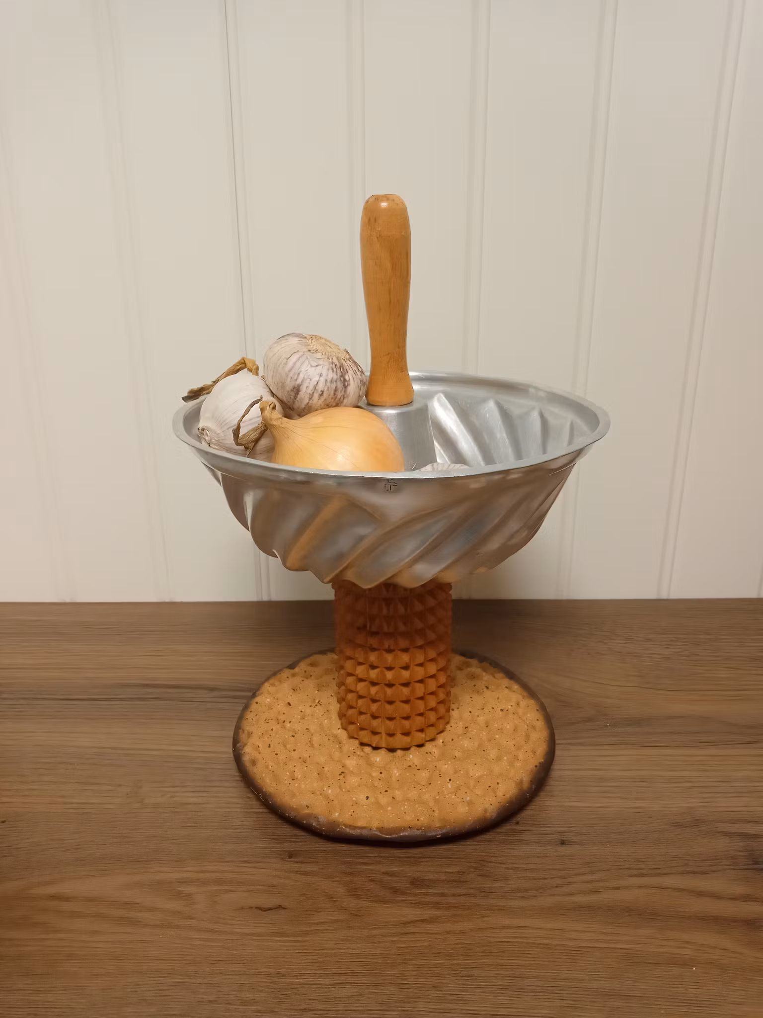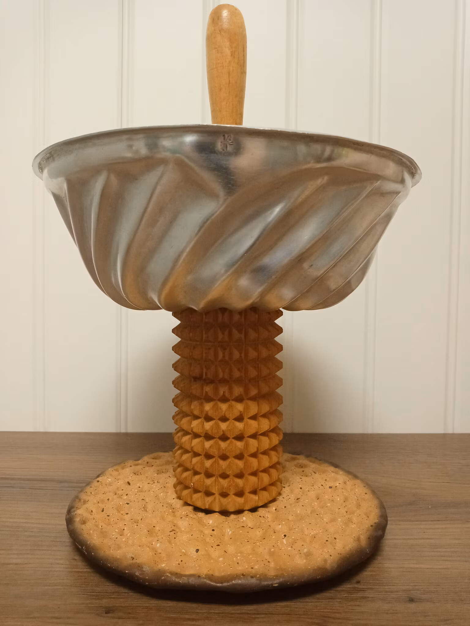 Bakform i aluminium. Foten är del av en kruskavel. Bottenplattan är ett grytunderlägg i gjutjärn. Höjd cirka 28.5 cm Diameter på bakformen 20.5 cm.