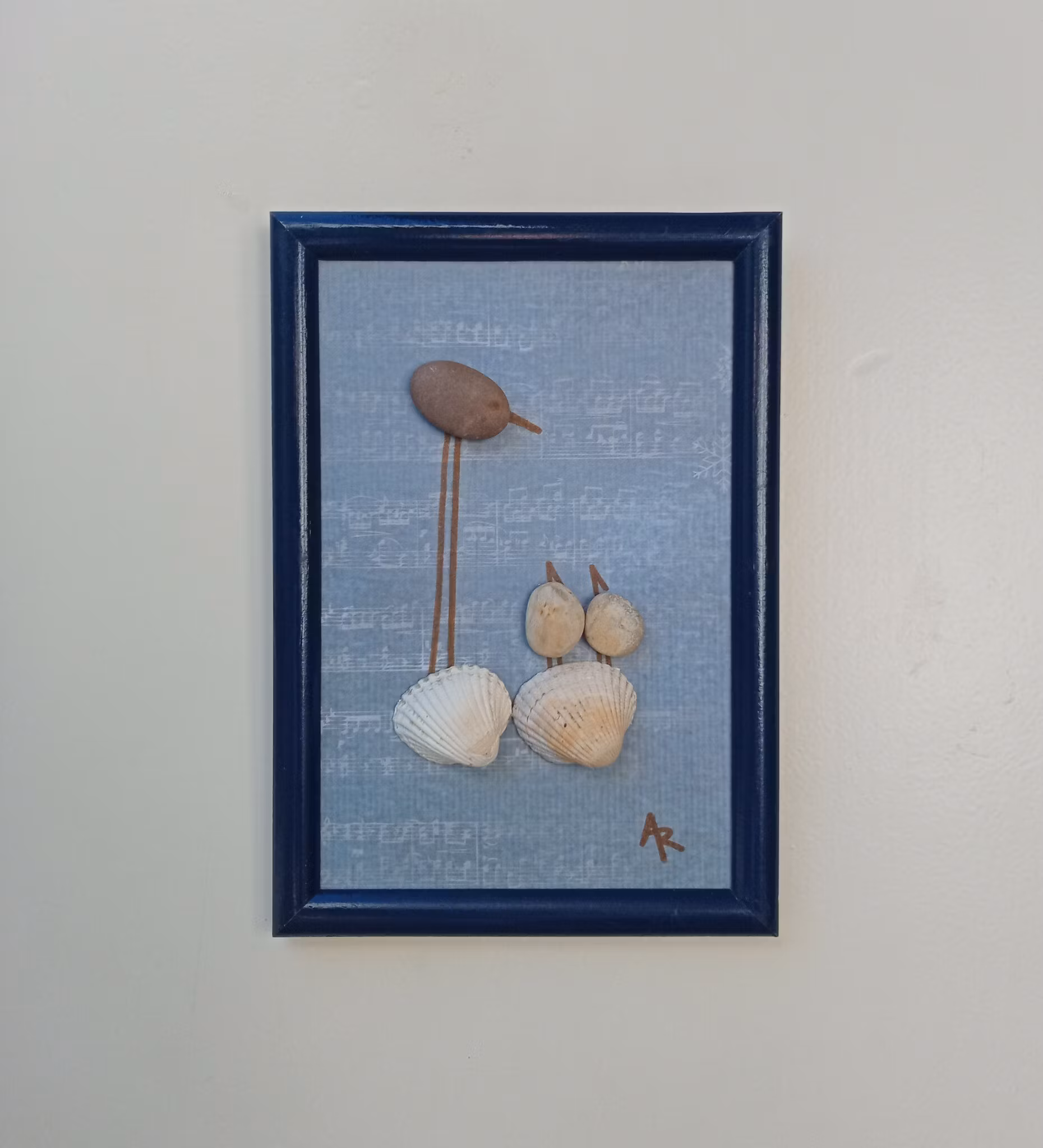 Unik handgjord tavla där stenar utgör fågelkropparna!