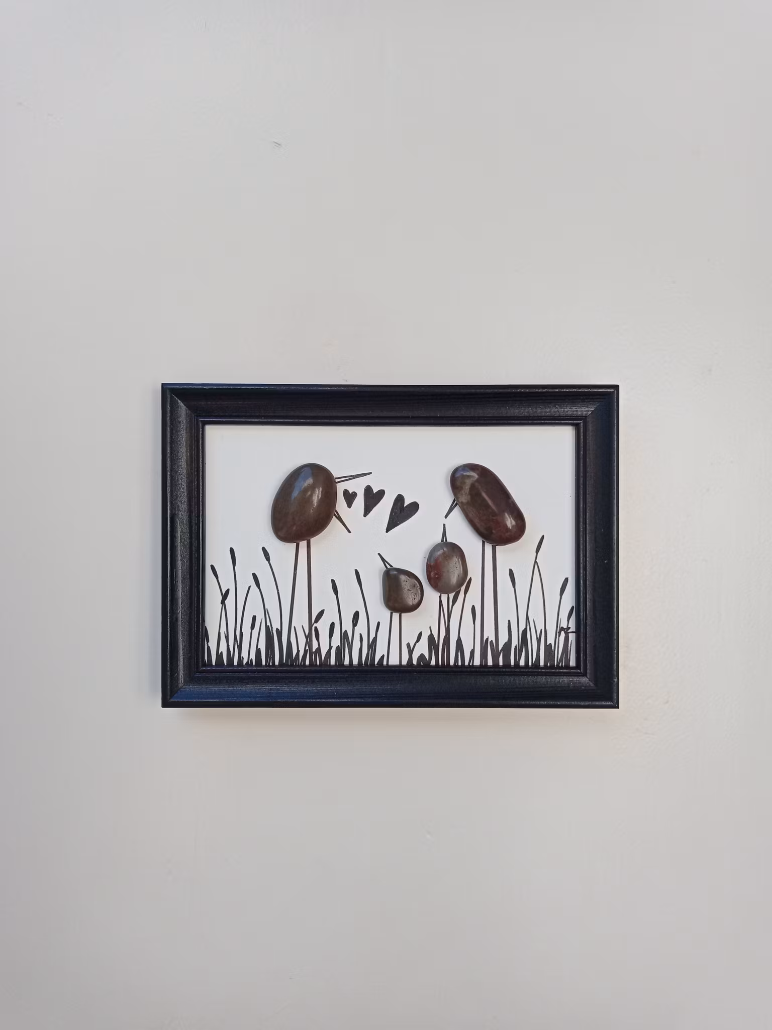 Unik handgjord tavla där stenar utgör fågelkropparna!