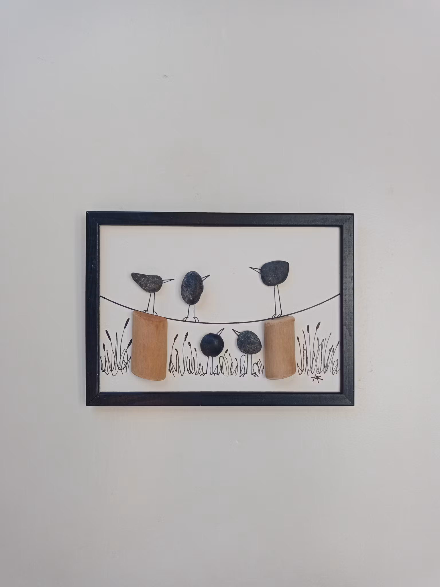 Unik handgjord tavla där stenar utgör fågelkropparna!