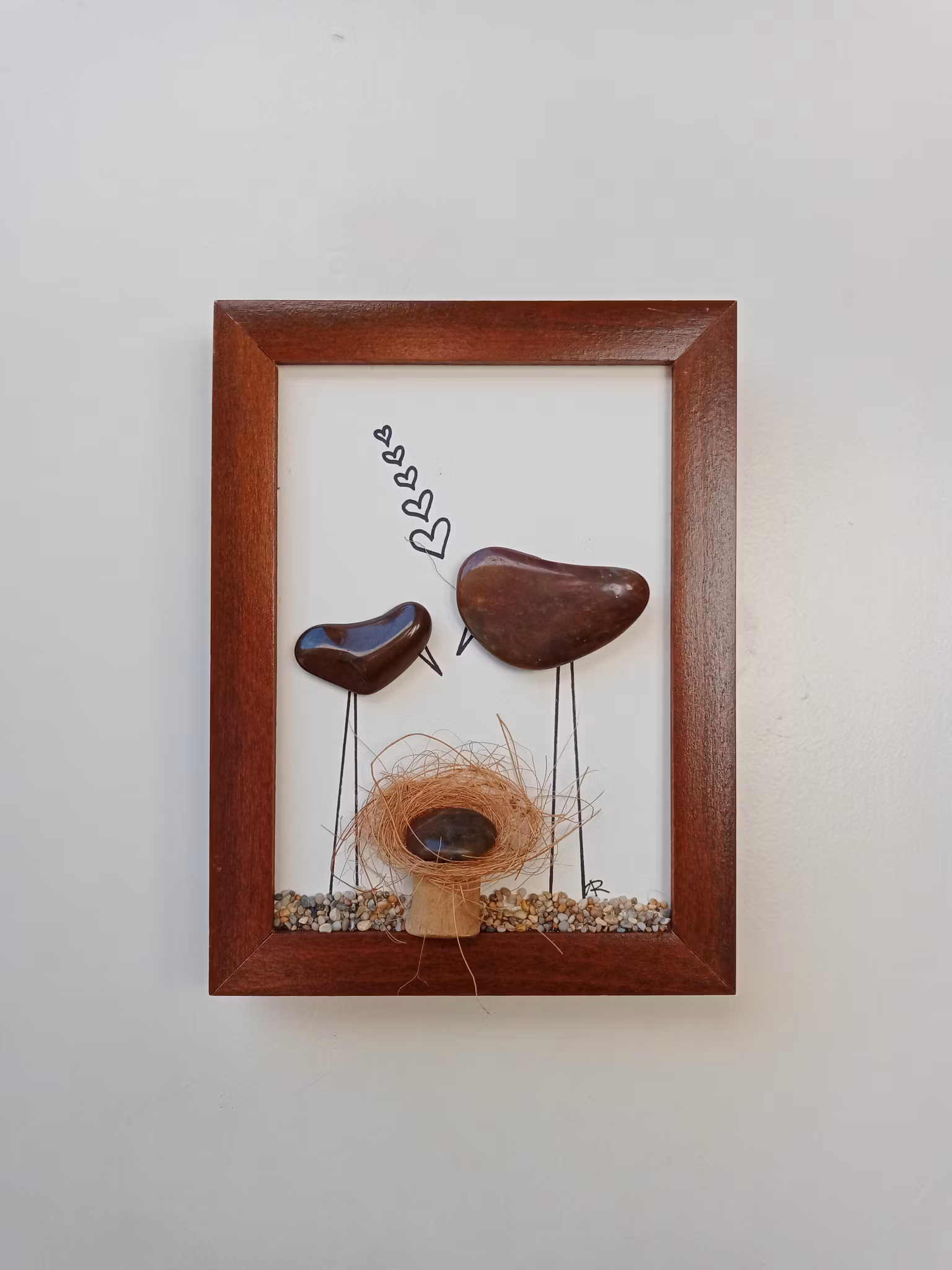 Unik handgjord tavla där stenar utgör fågelkropparna!