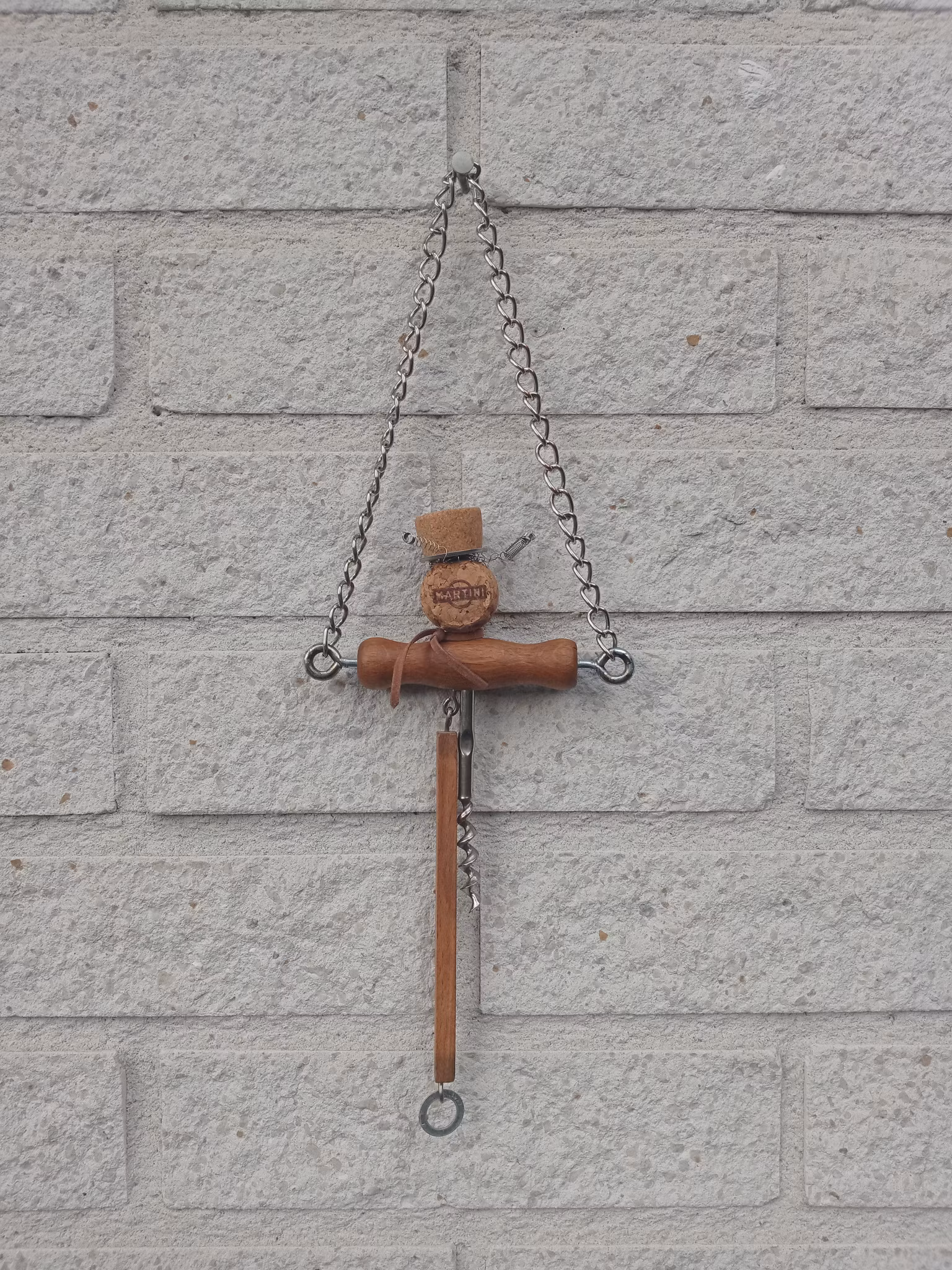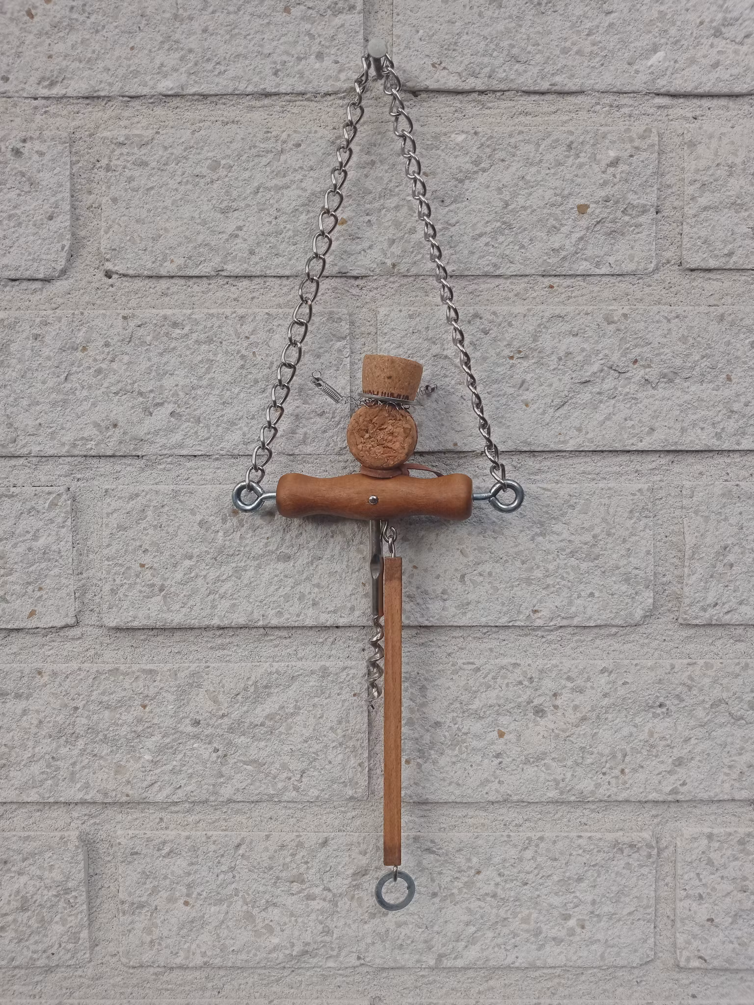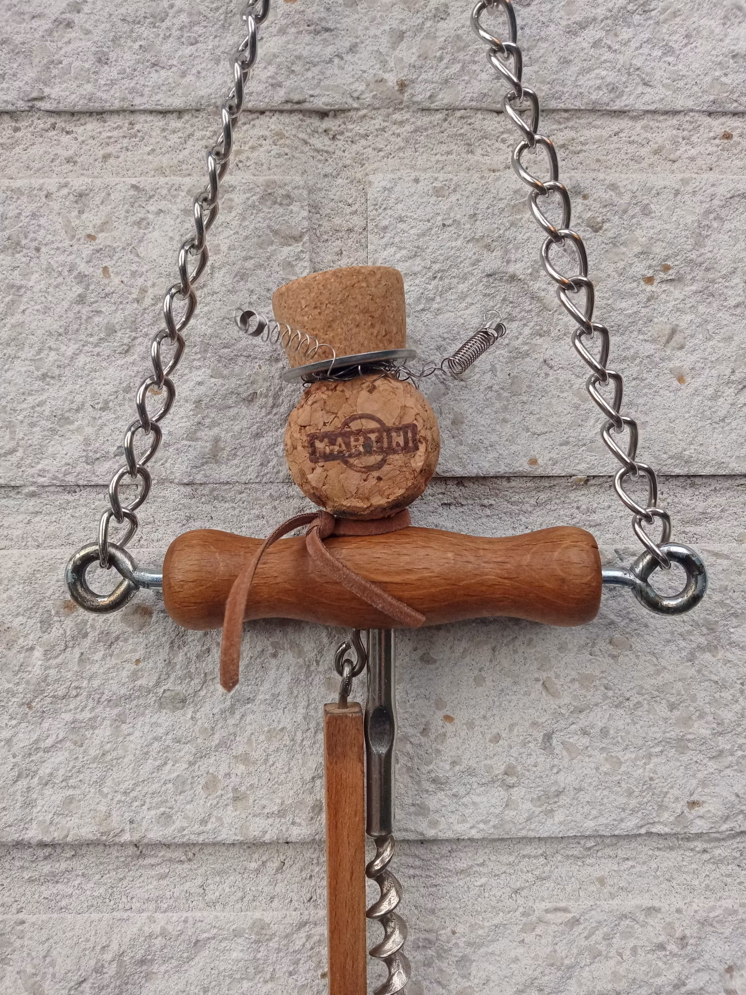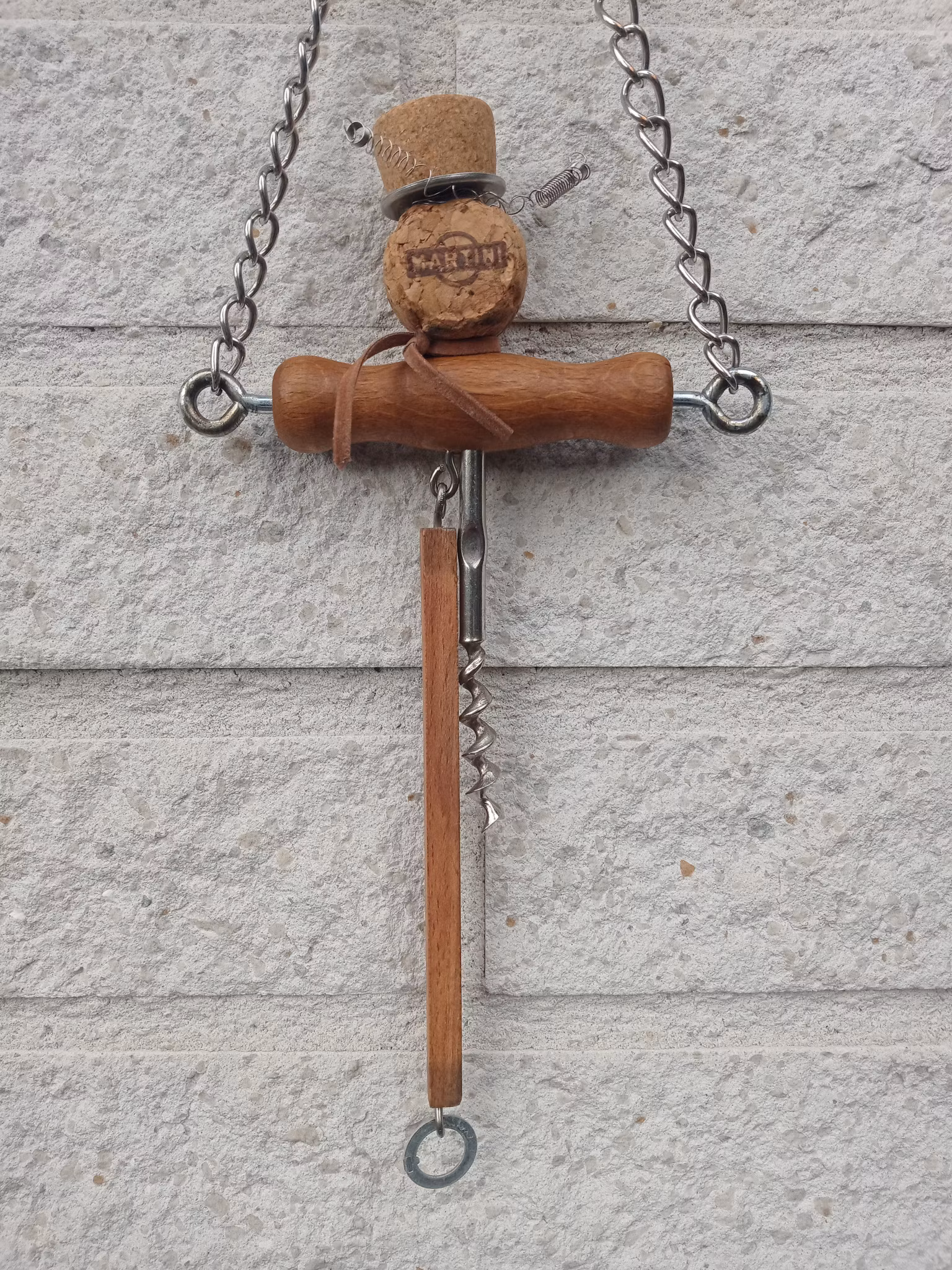Rolig figur till vinälskaren! Alster av bl.a en korkskruv och vinkork. Metall & trä. Höjd figur: 24.5 cm Totalt med kedja: 37.5 cm