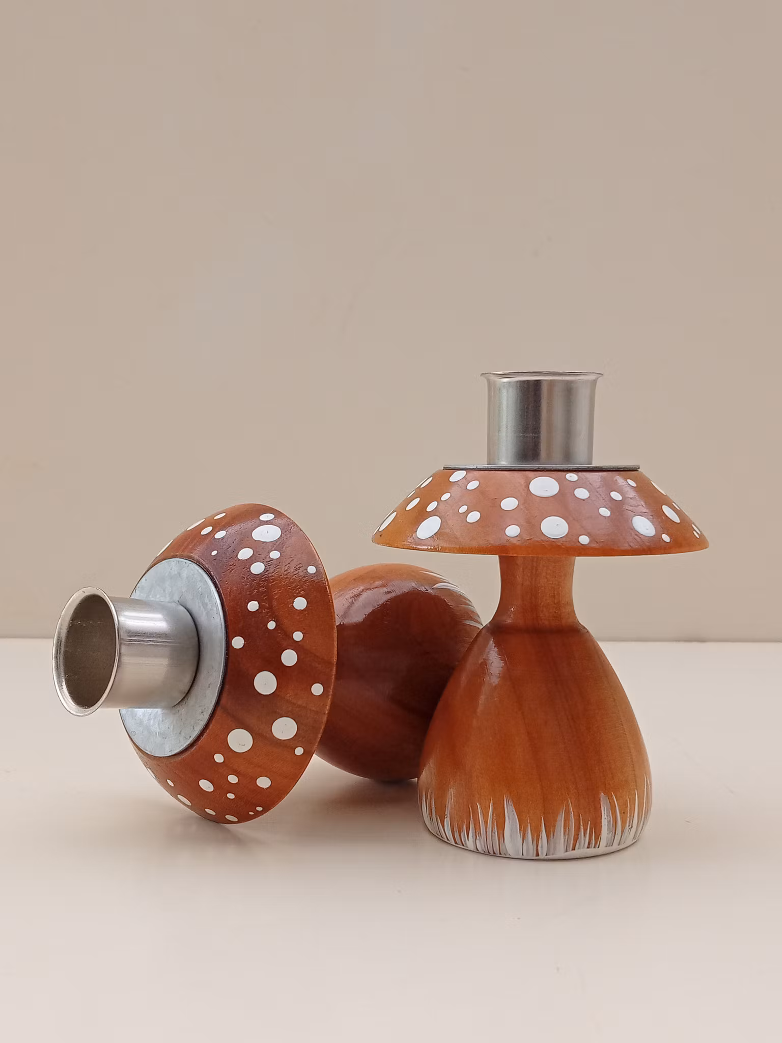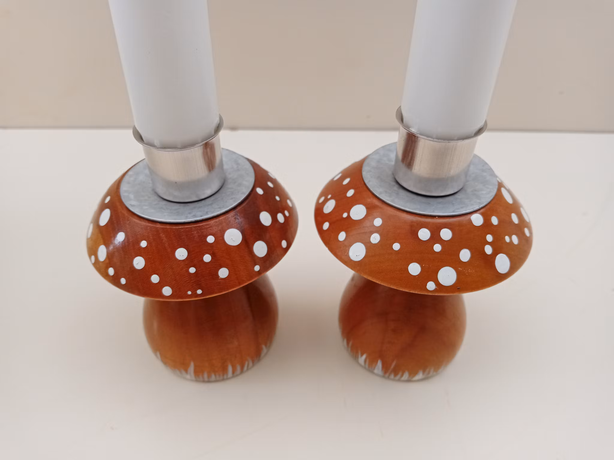 Handsvarvade trä-äggkoppar som gjorts om till ljusstakar. Motivet handmålat.