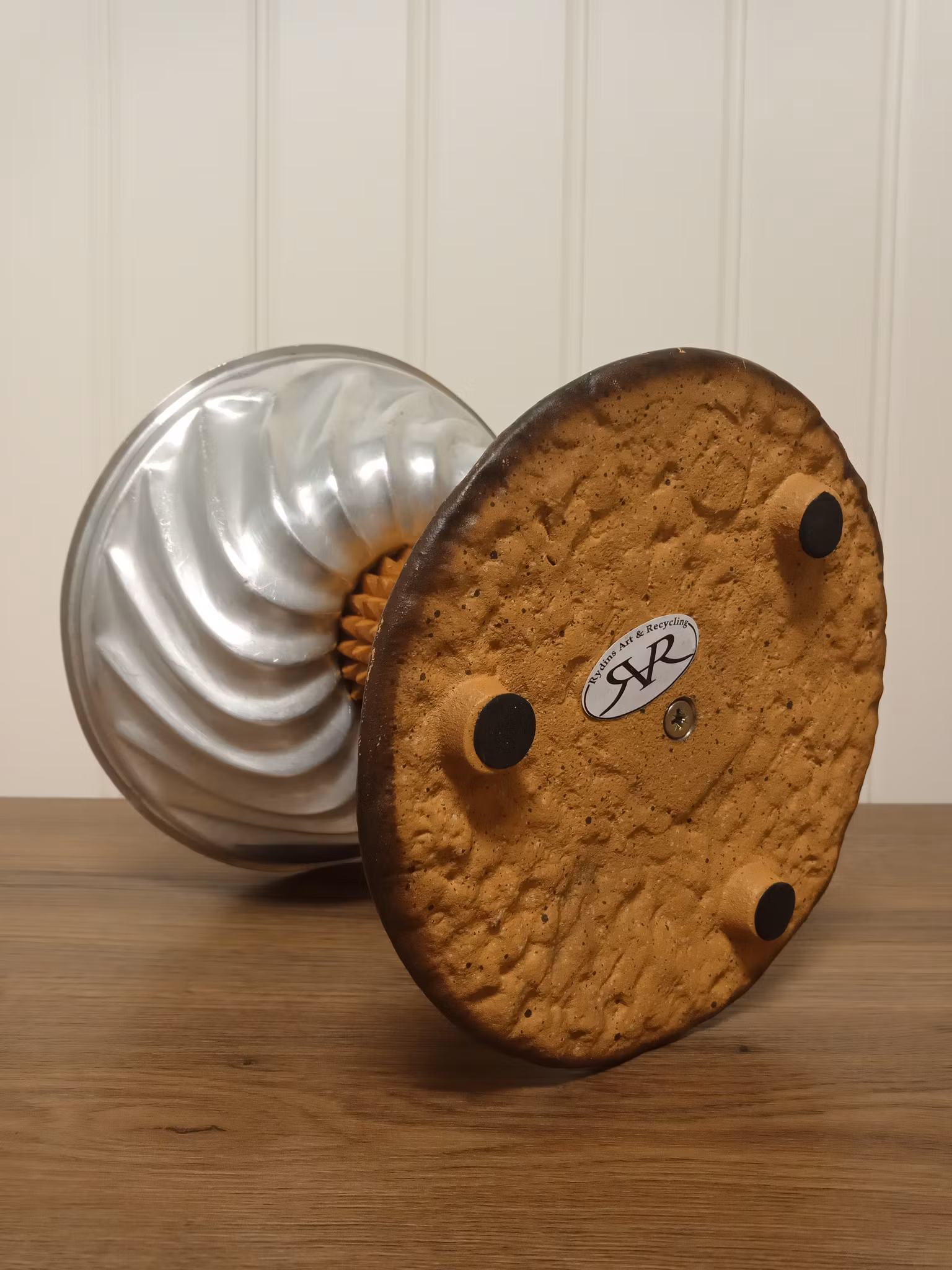 Bakform i aluminium. Foten är del av en kruskavel. Bottenplattan är ett grytunderlägg i gjutjärn. Höjd cirka 28.5 cm Diameter på bakformen 20.5 cm.